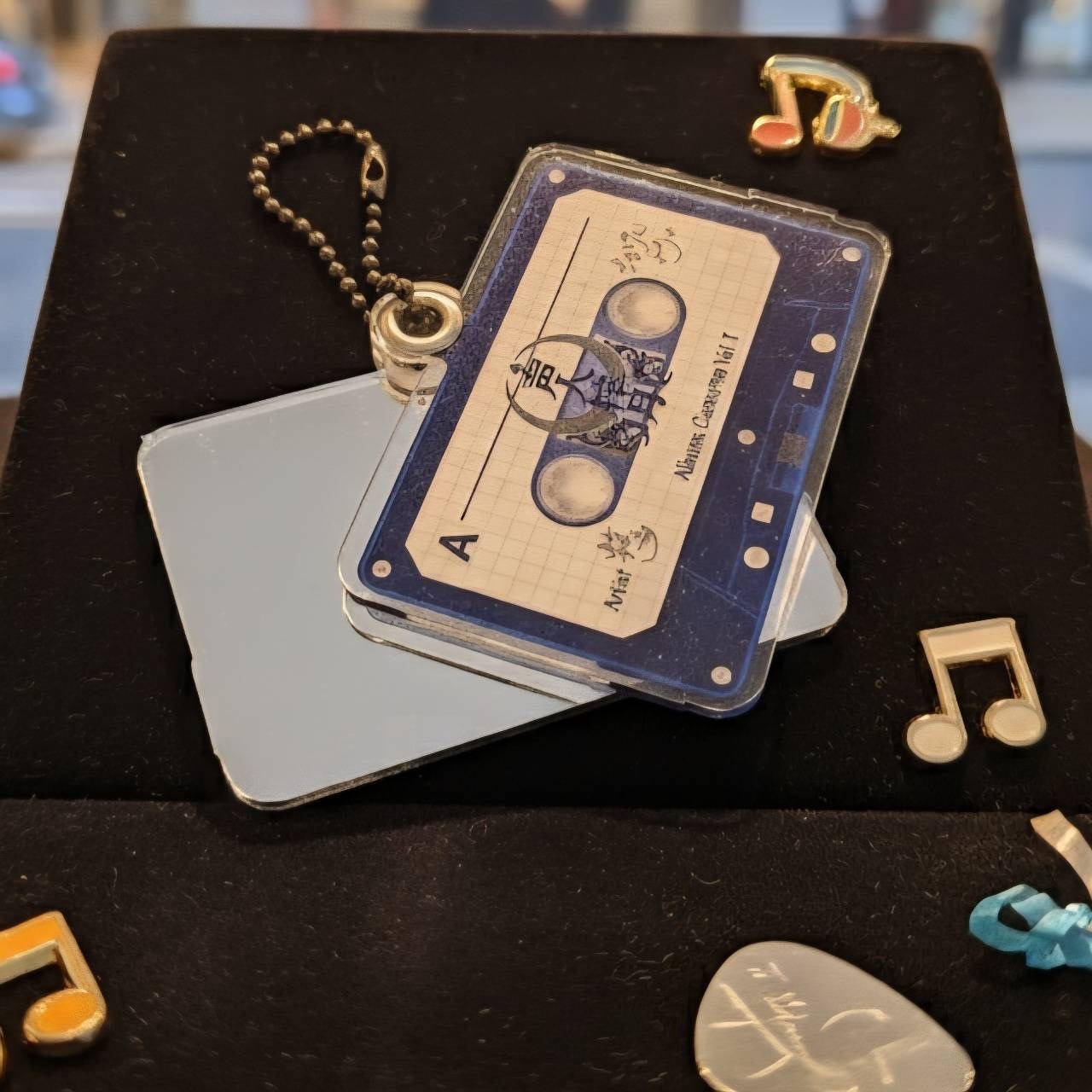 梓月がデザインした昔懐かしいレトロなカセットの形をしたミラー付きのキーホルダーです。(小さくサインも印刷してあります)